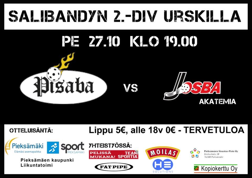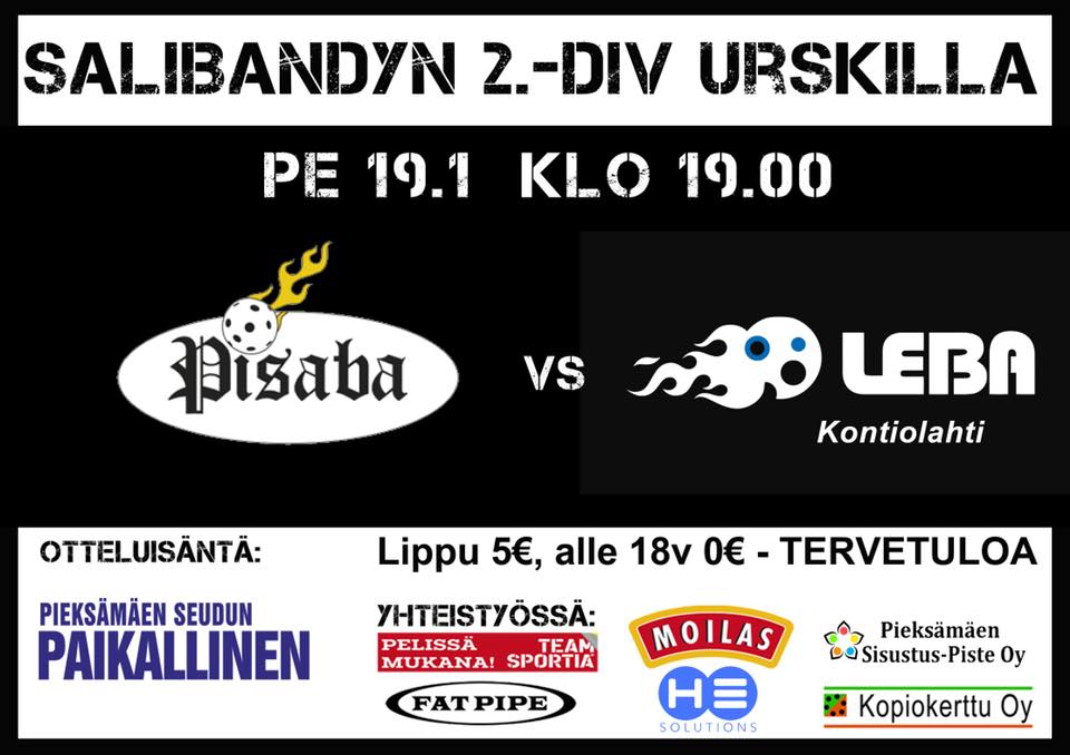 Pisaban miesten edustusjoukkue matkustaa tänään perjantaina Kontiolahdelle LeBa SB:n vieraaksi. Ottelu pelataan Kontiolahden liikuntahallilla alkaen klo 19. Jännittävää ottelua voi seurata täältä: http://salibandy.fi/tulokset/#/ottelu/leba-sb-pisaba/3270/2504