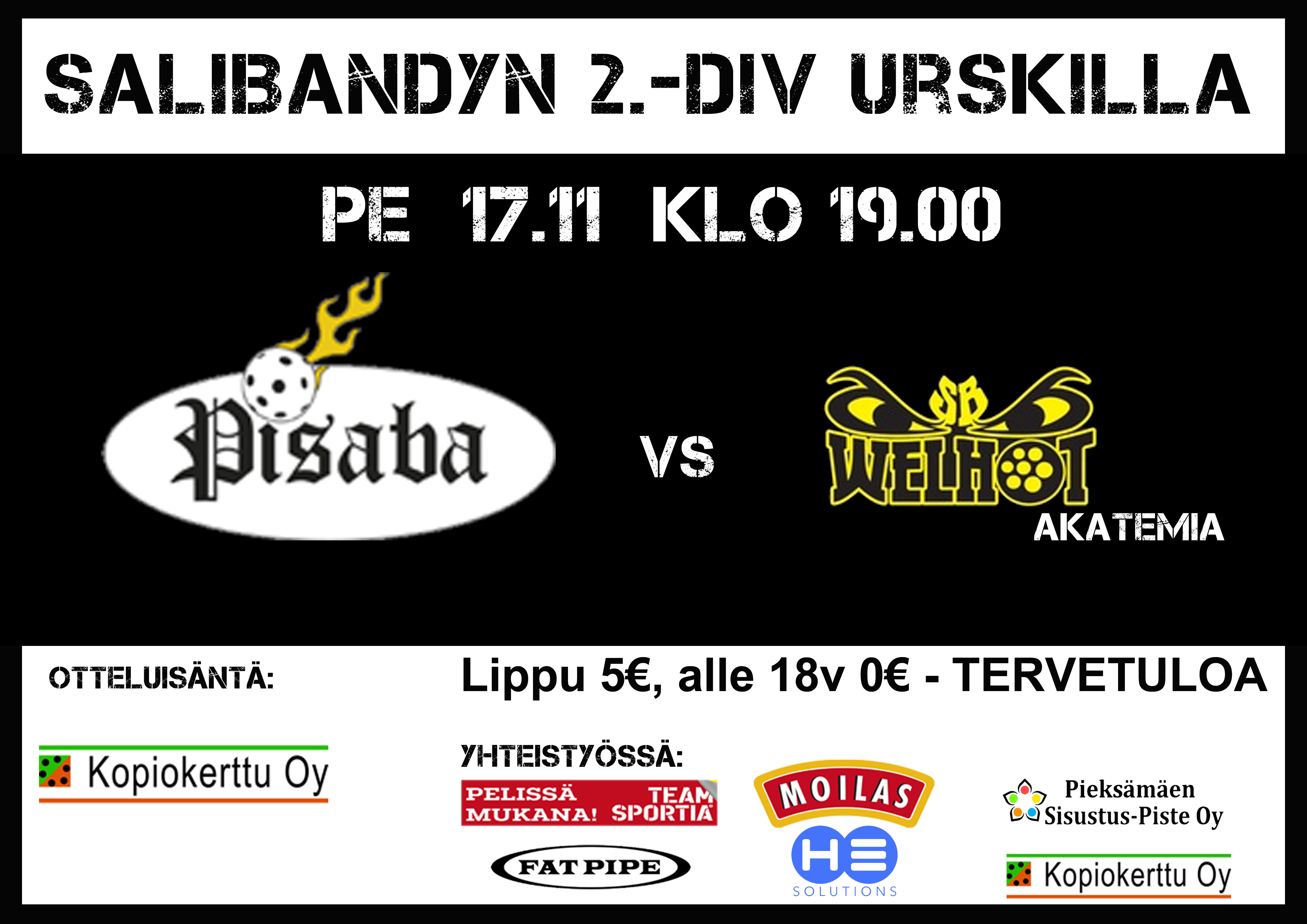 PISABA KOHTAA TÄNÄÄN PERJANTAI ILLAN HUUMASSA URHEILUTALOLLA RAKKAAN VIHOLLISENSA VEHMERSALMEN VESAN. OTTELUSTA EI PANOSTA PUUTU SILLÄ JOUKKUEET OVAT SARJATAULUKOSSA PERÄKKÄISILLÄ SIJOILLA (VEHVE 4.) JA PISABA (5.), MOLEMMAT 8 PISTETTÄ KERÄÄNNEENÄ. JOUKKUEET KOHTASIVAT VIIME KAUDELLA PLAY-OFFEISSA JOLLOIN VEHVE OLI PAREMPI VOITOIN 2-1, EDETEN LOHKON FINAALIIN.