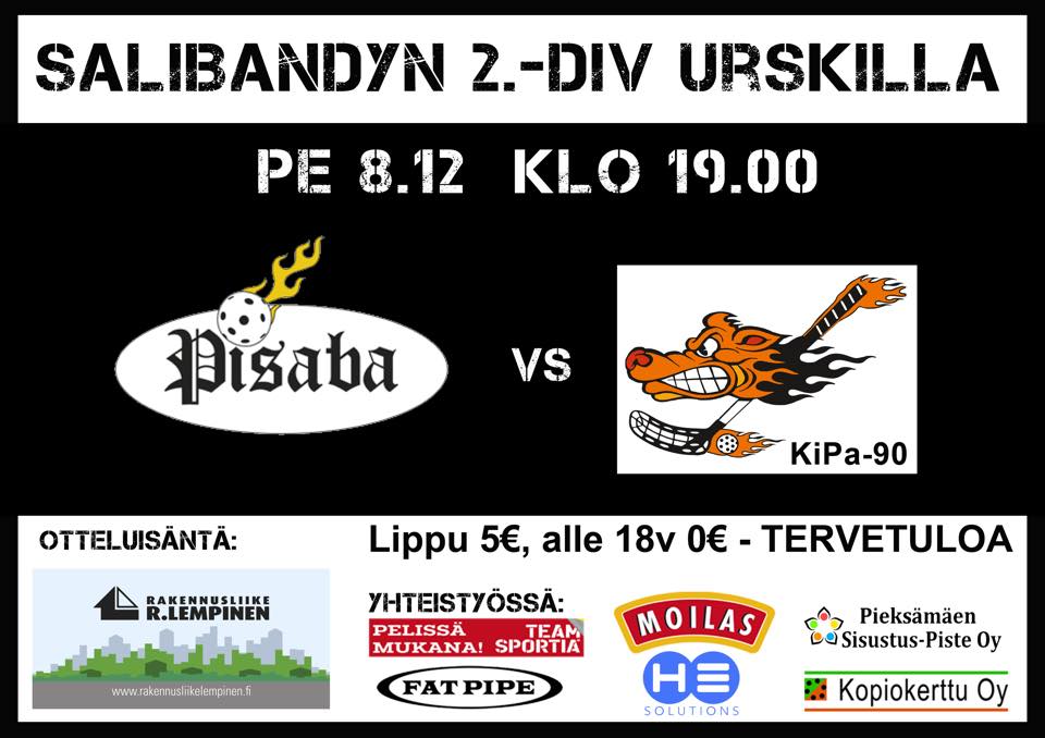 Pisaba kohtaa Kipa-90:n perjantai-iltana urheilutalolla. Lähtökohdat otteluun ovat kotijoukkueen kannalta herkulliset. Neljän ottelun voittoputki on siivittänyt joukkueen sarjassa sijalle 4. Viimeisimpänä muistona parin viikon takaa maukas voitto VehVestä kauden ehjimmällä kuusikymmen minuuttisella lukemin 8-5.